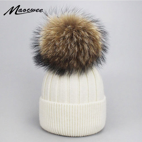 Girl Women Winter Wool Beanie Cap Real Raccoon Fur Pom Pom Parent-child Knitted Hat Core Yarn Warm Casual Skullies Beanies Bones![]()  - Regular price