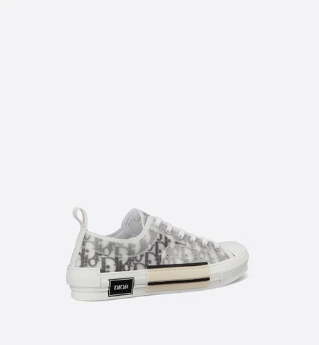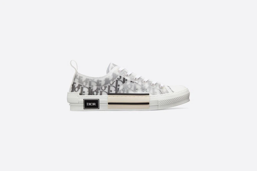 The B23 low-top sneaker is set apart by its white and black Dior Oblique motif and transparent paneling. Essential details, such as eyelets and a lace-up front, a white and beige rubber sole, a rounded and reinforced toe as well as a back tab recall the codes of the classic low-top style. The sneaker is further enhanced with contrasting details on the sides, including a 'DIOR' signature, and pairs easily with any casual outfit.