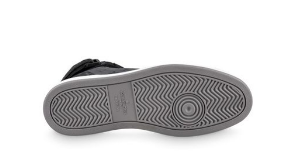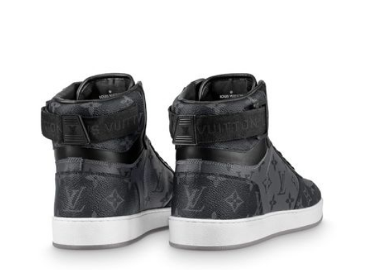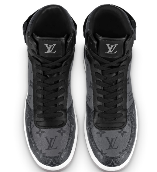 One of louis vuitton's signature styles, the rivoli sneaker boot is revisited in eclipse monogram and monogram reverse canvas. this classic hi-top features a velcro strap, which can be worn at the front or back. it is finished with black leather trim, a white rubber outsole and the lv initials in silver on the tongue.